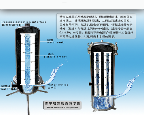 多芯精密過濾器是一種常見的過濾設備,可以用來過濾原水中殘存的微量懸浮顆粒、膠體、微生物等,隨著制水時間的增長,濾芯因截留物的污染,其運行阻力逐漸上升,當運行至進出口水壓差達0.1MPa時,應更換濾芯。多芯精密過濾器采用成型的濾材,在壓力的作用下,使原液通過濾材,濾渣留在管壁上,濾液透過濾材流出,最終達到過濾的目的。