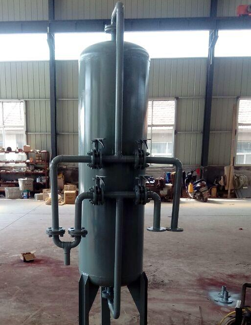 使用錳砂過濾器處理之后的井水經自吸泵加壓后流進曝氣裝置,主要的作用是使井水與空氣中的氧氣充分發生接觸反應。利用氧化處理的方法將水中低價鐵離子與低價錳離子氧化成高價鐵離子和高價錳離子之后迅速沉淀的一個方法。經過曝氧后的井水會到達沉淀池進行沉淀,(主要起緩沖的作用,使水具有足夠的時間發生沉淀)沉淀后的過濾水經過增壓泵加壓后進入除鐵除錳系統,它的主要作用是去除水中的泥沙,鐵銹,錳,紅蟲,藻類,金屬物質以及各種懸浮物等固體物質,錳砂過濾器在正常的工作條件中操作壓力為0.3pa,過濾的速度平均為15m/hr。